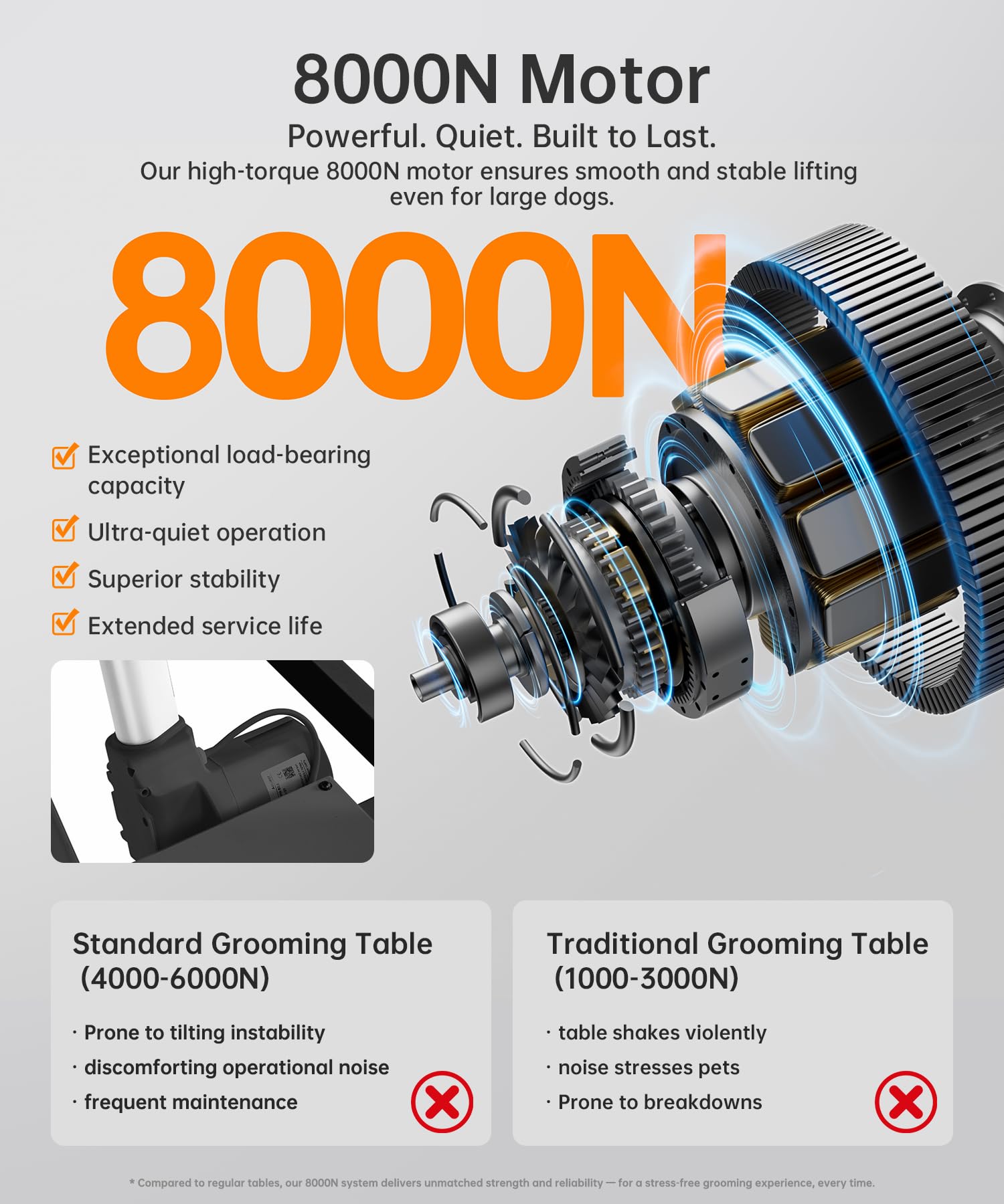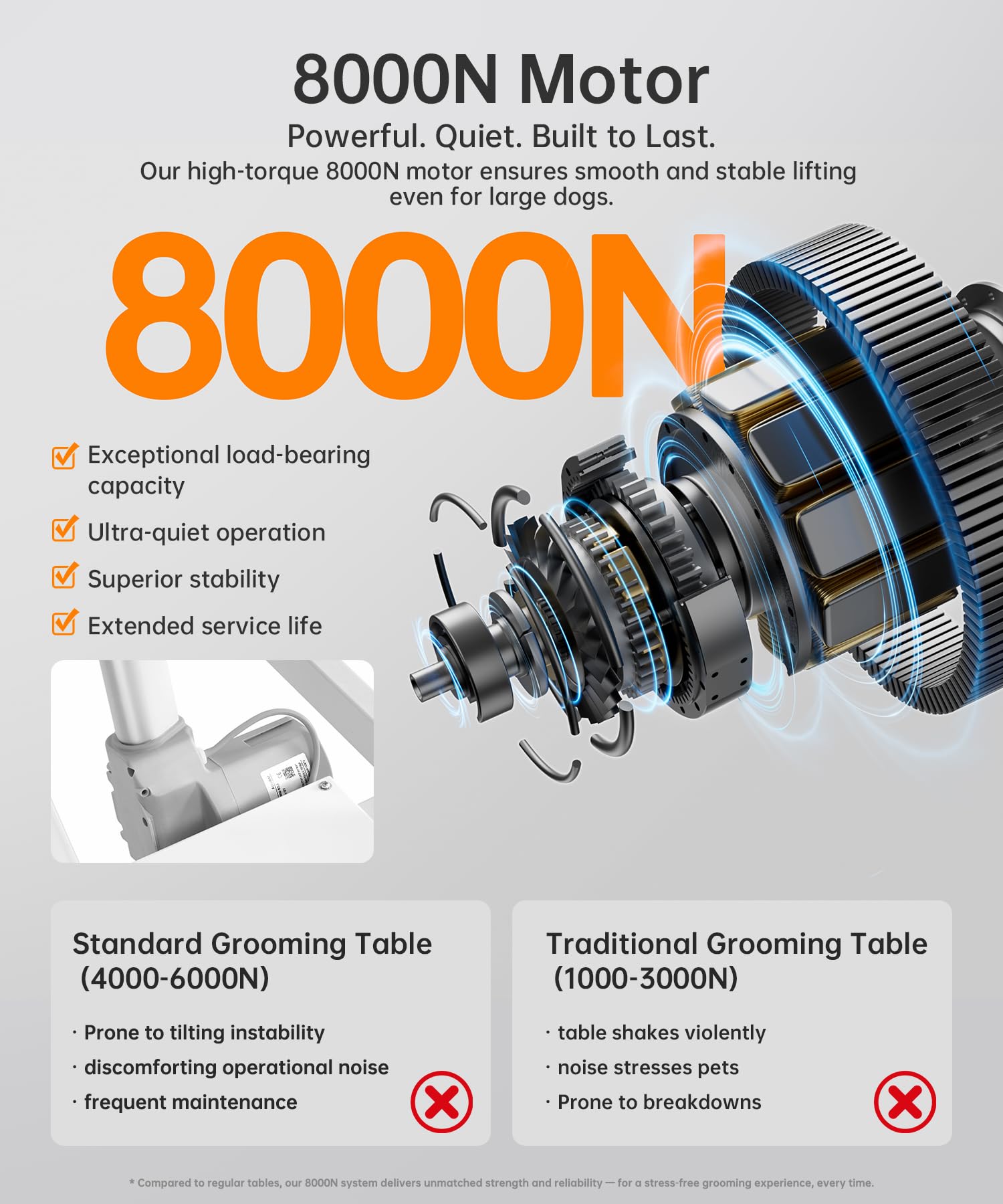 💪 Kraftig motor: 8000N løftekraft som håndterer opptil 135 kg (300 lbs) med stabil, stille drift. Perfekt for store og eldre hunder.
